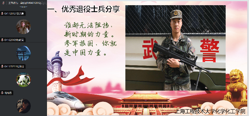 宣讲会上,退伍研究生常彤彤向大家分享了他的参军经历和军营生活,他说参军入伍,接受祖国的挑选,可以让自己更好地接近祖国、亲近使命、抵近理想。事实上,选择了触摸钢枪、触摸边关,也就选择了和祖国一起心跳、和祖国共同成长。参军报国,选择负重前行、把黑暗挡住,为祖国的强大厉兵秣马,你就是了不起的中国力量!
