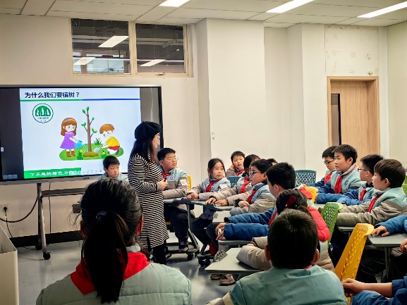 胡老师以“为什么要植树”的提问开场,引导同学们思考参与植树活动的意义。随后,胡老师向同学们讲解了植物的作用,介绍了植树和实现国家“双碳”目标间的联系,并引导同学们讨论:实现“双碳”目标如何用好绿色力量?除了植树,我们还能做什么?胡老师通过层层递进的问题激发了同学们浓厚的学习兴趣。胡老师还以最“接地气”的方式向同学们普及了习近平总书记最新提出的“绿色发展是高质量发展的底色,新质生产力本身就是绿色生产力”论述。同学们求知若渴,争相回答问题,在与老师一次次的互动中加深了对“绿色力量”的认识。讲座最后,胡老师呼吁同学们树立人与自然和谐共处观念和绿色低碳意识,携手为大自然与社会增添一份绿意!