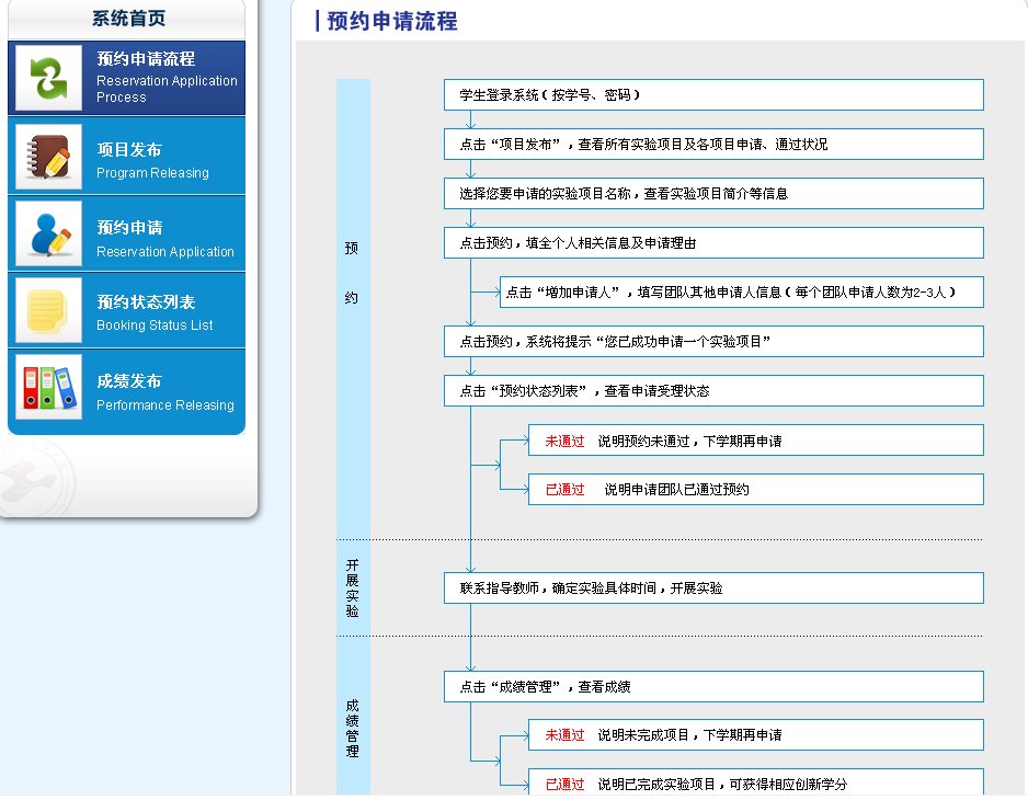 本学期申请预约下学期实验项目——教师择优选拔,审批通过——下学期开展实验——成绩合格,获得创新创业学分。