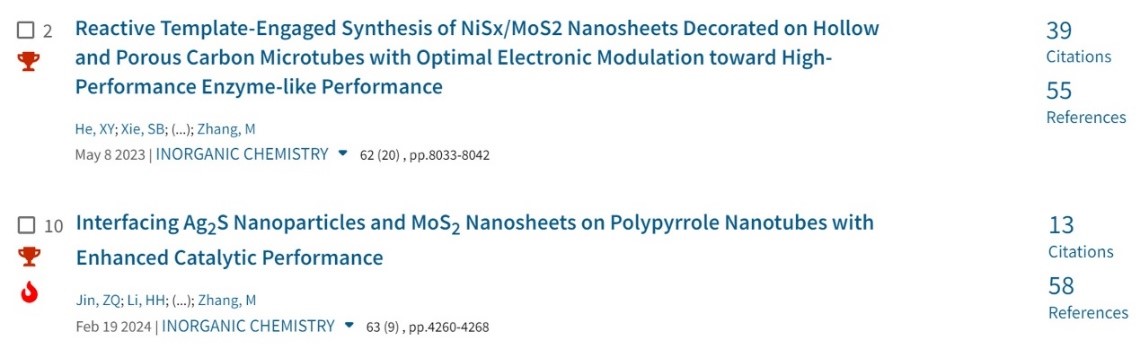 蓝鲸体育张敏教授课题组长期从事镍基和二硫化钼基纳米复合材料的设计、组装及应用。2019年以来,课题组围绕“基于管状二硫化钼功能化纳米复合材料的合成及构效”研究开展了一系列工作,发展了一步牺牲模板法制备二硫化钼管状复合纳米材料共聚技术,并将其应用于类酶催化、生物传感和高级氧化及脱盐等领域。其中,在国际著名期刊Inorganic Chemistry(IF 4.3,二区,自然指数期刊)发表的论文,受到广泛关注,成功入选新一期的ESI前1%及热点论文。