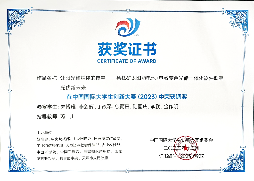 近日,教育部正式颁发中国国际老员工创新大赛(2023)(原中国国际“互联网+”老员工创新创业大赛)奖项,蓝鲸体育芮一川老师指导的朱博雅、李剑辉、丁改琴、徐雨田、陆国庆、李鹏、金作明团队项目《让阳光绚烂你的夜空——钙钛矿太阳能电池+电致变色光储一体化器件照亮光伏新未来》荣获国赛铜奖,这是公司参赛团队在本届赛事取得的最好成绩,也是公司在高教主赛道上的唯一获奖团队。