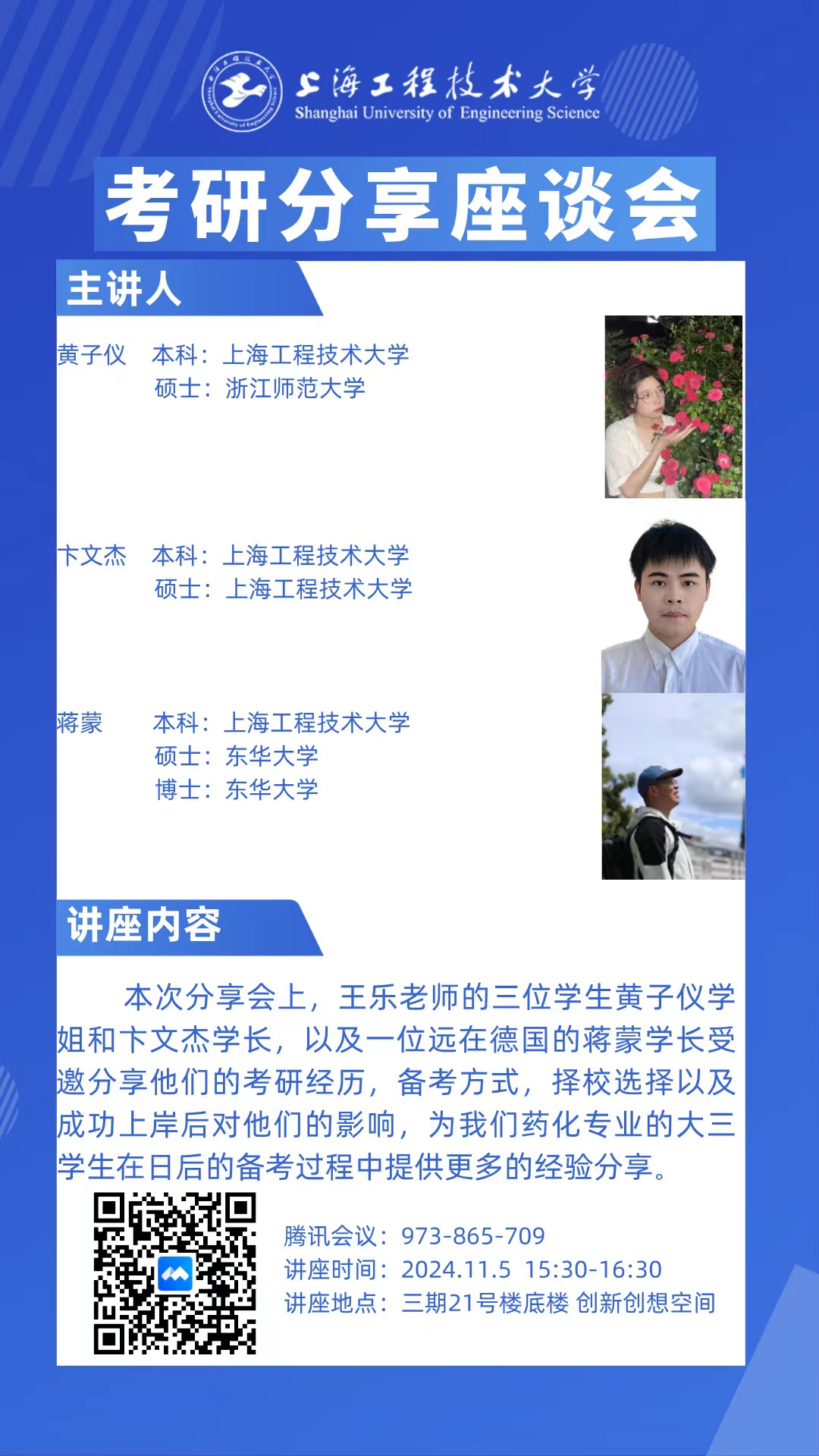 近日,蓝鲸体育举行了一场旨在帮助药物化学专业大三员工理清考研思路、明确考研方向的座谈会。此次座谈会由2022级药物化学专业班主任王乐老师主持,班长顾文毅协助,邀请了三位优秀的学长学姐,他们分别是黄子仪(线上)、蒋蒙(线上)以及卞文杰。三位学长学姐围绕择校、备考思路、复习安排以及个人建议四个方面,为在场的学弟学妹们提供了宝贵的经验。
