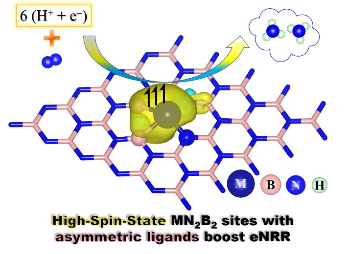 电催化氮气还原反应(eNRR)可实现常温、常压环境条件下的合成氨(NH3)生产,成为小规模现场合成氨的有效解决方案,但由于缺乏能够高效选择性地将N2转化为NH3的阴极电催化剂,该领域的发展和实际应用受到严重阻碍。安炜教授指导研究生房聪采用密度泛函理论(DFT)计算方法,对二维氮化硼(BN)纳米单层缺陷位内嵌的IIIB, IVB, VB族等9种过渡金属(M)单原子活性位上的eNRR性能进行了系统研究,发现eNRR顺序加氢基元反应中存在着活性中心的磁涨落,揭示了金属单原子活性中心的电子自旋态在调节eNRR限制电位步骤中具有关键作用,高自旋的MN2B2活性位有利于降低eNRR极限电位。计算结果表明, MoN2B2 (磁矩μ = 2μB) , VN2B2 (μ = 3μB) , CrN2B2 (μ = 4μB) 活性位上的eNRR活性及生成NH3的选择性递次增高,非对称N2B2配体优于常见的单一配体;提高MN2B2活性位M中心的电子自旋态,有助于打破eNRR关键含氮反应中间体(*N2H/*N2和 *NH2/*N2)吸附能之间的线性比例关系,活性位适中的氮亲合性对实现高效的eNRR至关重要,而N2吸附能与eNRR极限电位之间的Sabatier火山型曲线关系也佐证了这一重要论点。该工作为精准设计eNRR活性位提供了新思路和理论依据。