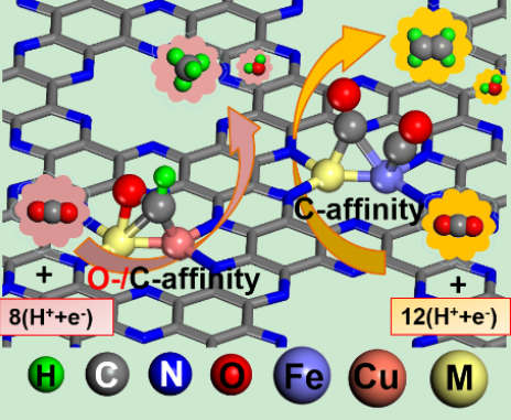 电催化二氧化碳还原反应(CO2RR)可在温和环境条件下,将CO2直接转化为小分子燃料和化学品,当使用清洁能源提供电力时,可成为实现可持续化学和碳中和能源未来的一种可行的解决方案;然而,目前CO2RR催化剂仍面临过电位高、电流密度低、生成目标产物法拉第效率低等中长期主要挑战。为此,已经尝试并实现了许多基于理性设计的新颖催化电极材料,其中就包括著名的单原子催化剂(SAC),而作为SAC的一个增强平台,双原子催化剂无疑是一个很自然的选项。安炜教授指导研究生刘海美、黄庆亮采用DFT计算方法,系统研究了C2N(一种多孔氮化石墨烯纳米材料)空腔内嵌七种Fe和Cu基同核和异核双原子上的CO2RR性能。计算结果表明,金属双原子N2M2N2活性位和C2N基体对活化O=C=O惰性键具有明显的协同效应,可在较低的极限电位(UL)下驱动CO2RR生成C1+产物;其中,当金属双原子M2为FeFe, FeCo,FeNi,FeCu 时,CO2RR优先生成C2H4,当M2为CuCo,CuNi, CuCu 时,CO2RR优先生成CH4;同时还发现,*CO+*CO在M2上的共吸附强度,可作为CO2RR生成C2产物的活性描述符,中等强度的共吸附有利于降低UL,M2的碳亲和性对C-C键偶联和C2H4的形成影响最大,而CH4的形成则受到M2碳亲和性和氧亲和性的双重控制。该工作有助于厘清CO2RR中复杂竞争反应之间的关系,为充分利用双原子调变的多样性和协同效应优化设计高效的阴极电催化剂,提供了理论指导和预测。