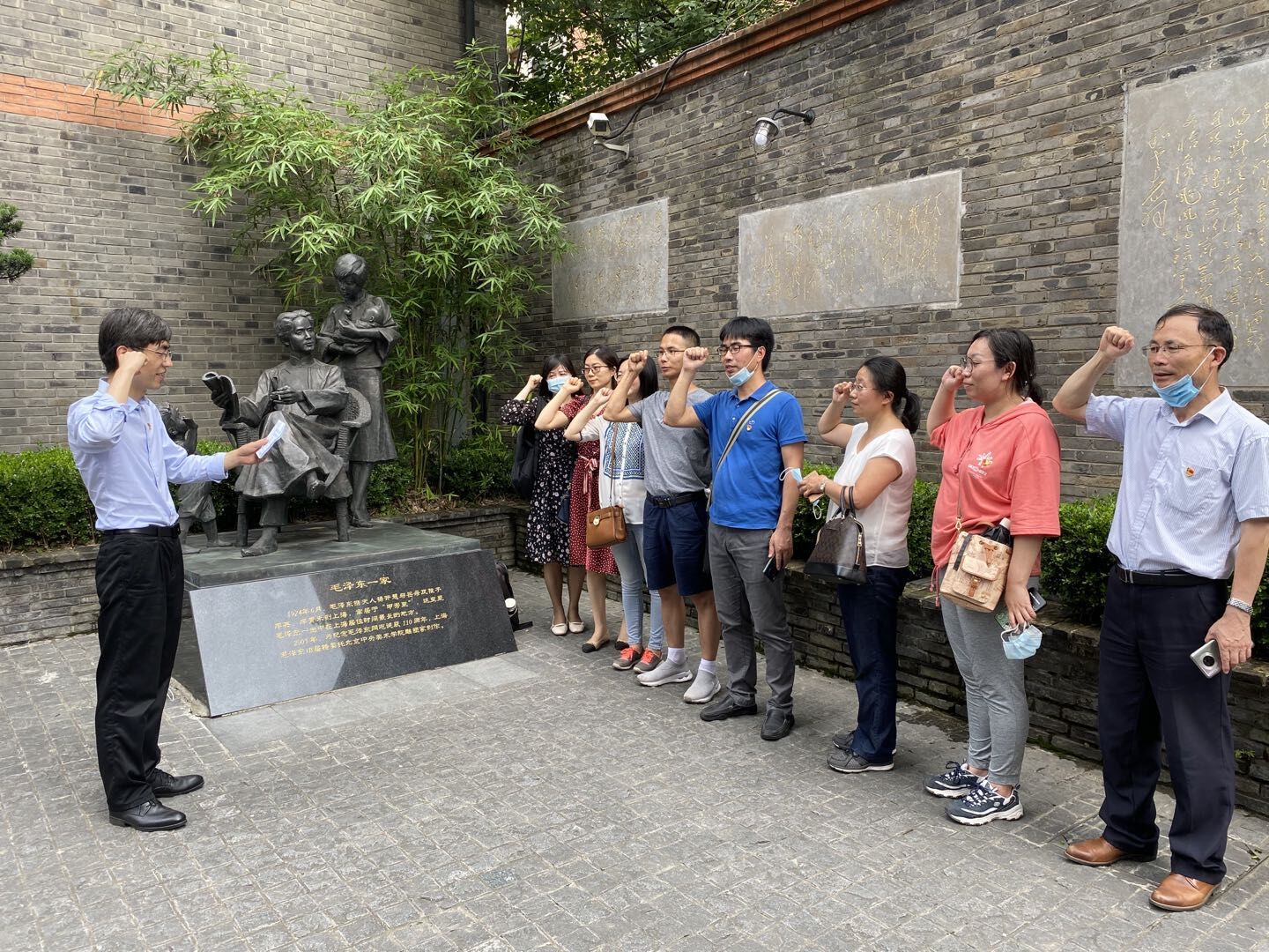 同时在公司副经理李亚带领下,同志们在上海毛泽东旧居毛主席雕像前,面向鲜红的党旗,举起右拳,重温入党誓词。这是一堂生动的党课,党员同志们牢记艰苦奋斗的革命精神和全心全意为人民服务的宗旨,坚定决心继承和发扬党的优良传统,立足教育事业,积极工作,充分发挥先锋模范作用。