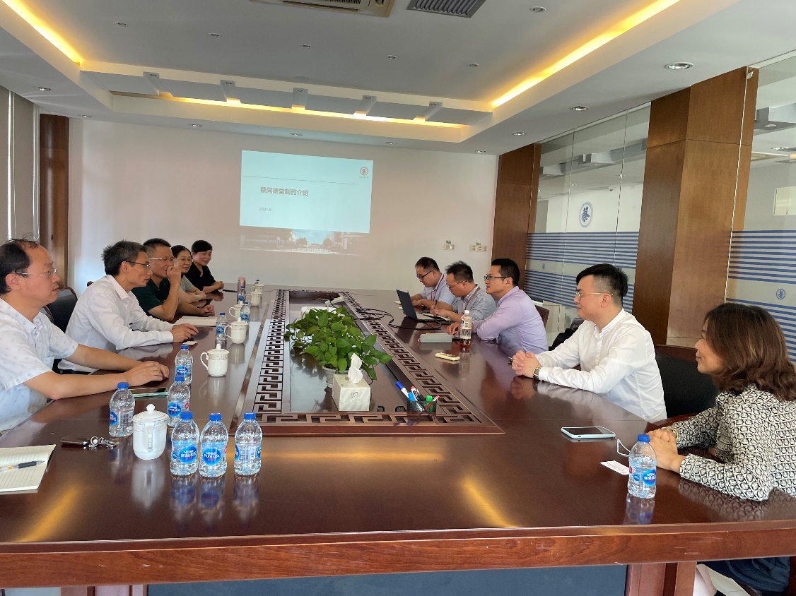袁春平副经理介绍了医药前沿技术研究院以及上海药物制剂智能装备工程技术研究中心的建设情况和发展定位,并介绍了具体的可合作领域。单宏丽副经理介绍了医药前沿技术研究院最近获批立项的上海市心脑血管非编码RNA成药性前沿科学研究基地情况。刘余敏厂长介绍了公司的基本情况和今后的发展愿景。双方进行了友好热烈的交流,一致同意开展战略合作,并初步达成了合作项目的意向。随后大家参观了公司的质检部、提取车间、制剂车间。
