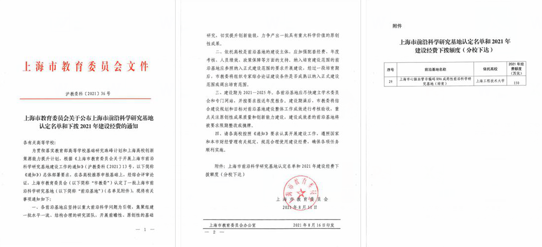 近日,上海市教委公布了前沿科学研究基地认定名单,公司蓝鲸体育牵头申报的上海市心脑血管非编码RNA成药性前沿科学研究基地(培育)获批立项,建设周期为2021-2025年。