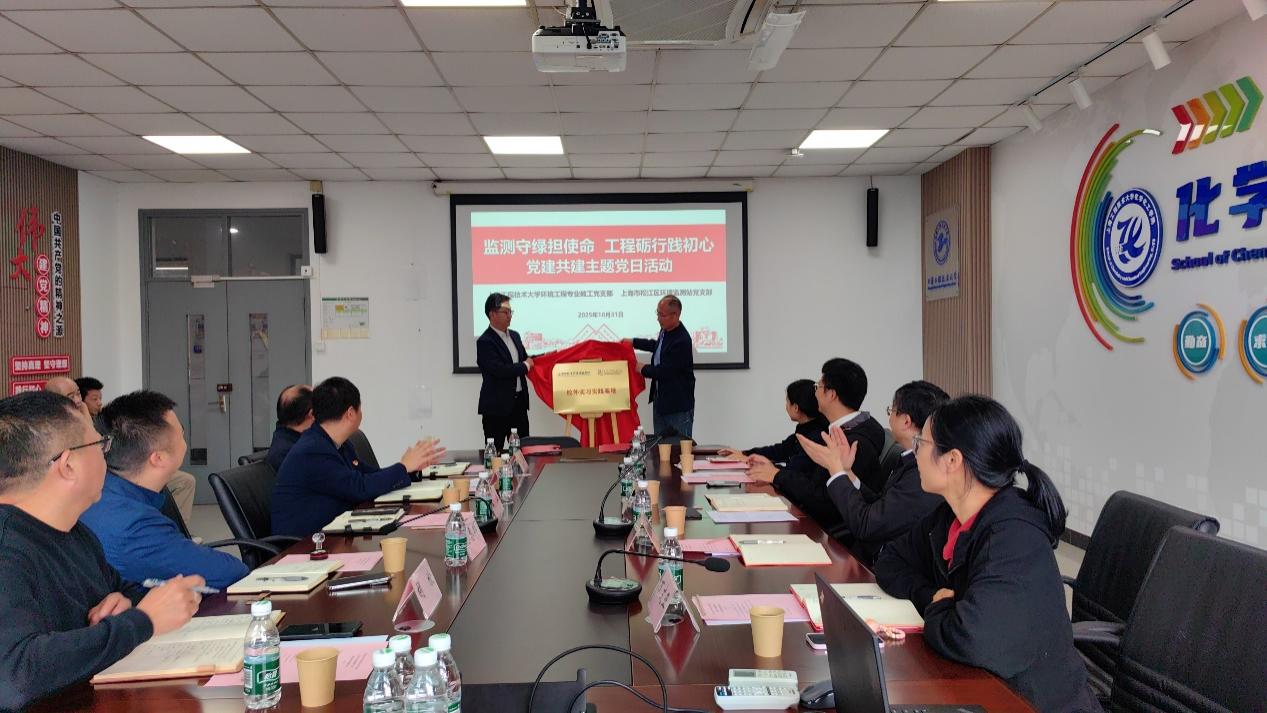 在全体与会人员见证下,双方党支部书记共同签署了党建共建协议书,随后,章立和宋勤健共同为区环境监测站成为公司实习实践基地揭牌。