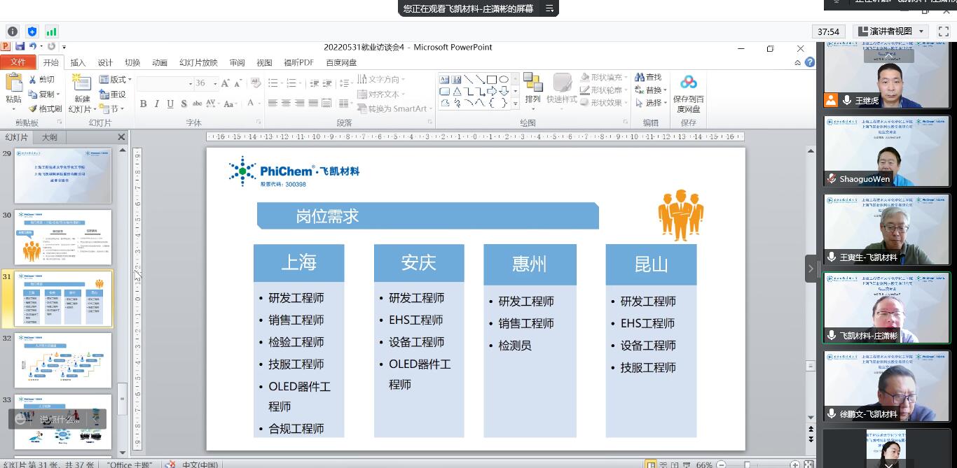 接着庄潇彬经理介绍飞凯在招岗位、历届招聘工程大毕业生情况以及暑期实习生需求。目前公司已经招聘涂料工程和高分子材料与工程专业4名员工。企业在研发工程师、工艺工程师、OLED器件工程师、销售工程师、技服工程师、检测员/实验员、设备工程师、EHS工程师、检测工程师、知识产权&合规工程师等岗位仍有需求。涉及公司多个相关专业。