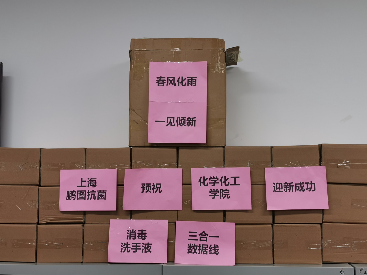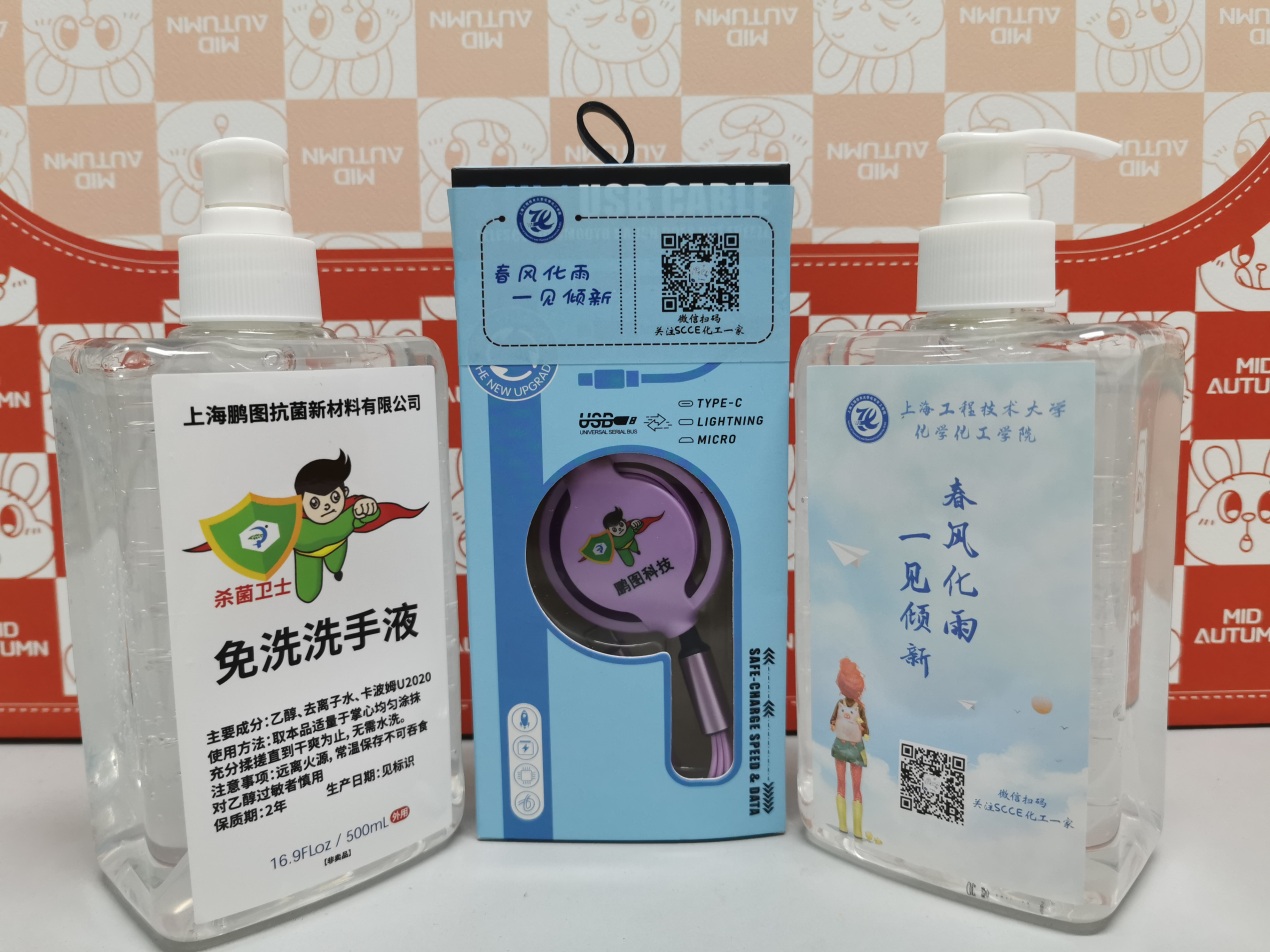张栋栋员工赠送的新生礼品包含免洗洗手液500份、数据线700份。其中免洗洗手液为张栋栋员工所在单位上海鹏图抗菌新材料有限公司的产品。张栋栋员工目前在该单位担任技术服务总监一职。