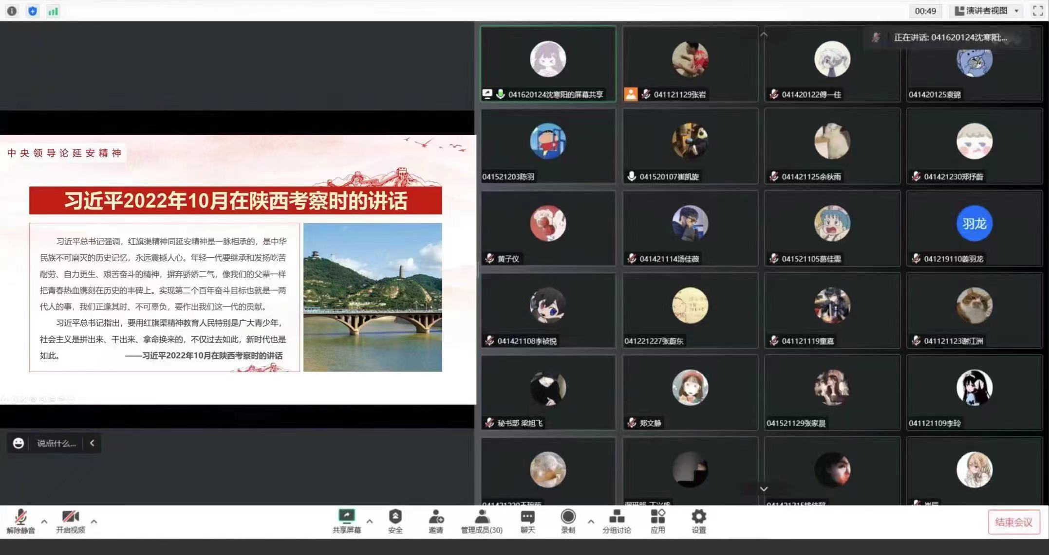 员工团干部通过“延安精神解读”、“延安精神的现实启示”、“中央领导论延安精神”三个方面全面学习了延安精神。学习结束后,大家也积极发言讨论。崔凯旋同学表示,通过此次线上参观,我们看到了老一辈革命家的延安生活,也深刻的体会到了延安精神的重要性和传承性。今后我们也要将延安精神落实到日常生活中。