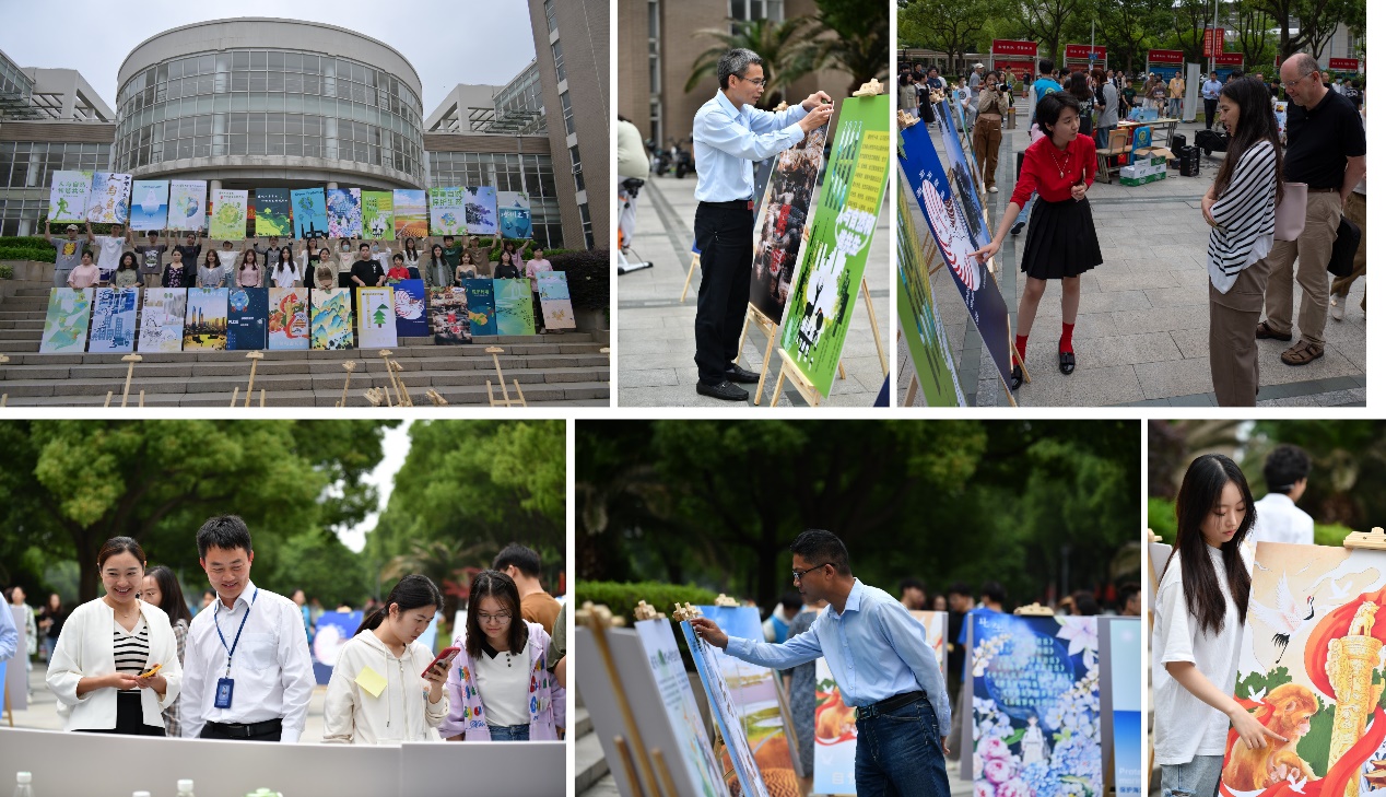场地中央展出了30幅由公司员工创作的环保宣传海报。围绕今年世界环境日的主题“建设人与自然和谐共生的现代化”,这些海报以艺术化的形式体现了员工们对“绿水青山就是金山银山”“人与自然是生命共同体”“良好生态环境是最普惠的民生福祉”等重要生态文明思想的理解,倡导广大师生关注环境污染问题、践行绿色低碳生活。海报的作者们热情地向现场参观的师生介绍自己的作品,观众们则为喜爱的作品贴上一片绿色的树叶以示支持。