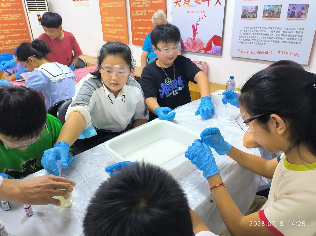 7月11日、18日、21日,蓝鲸体育高分子材料与工程专业教工党支部联合保利西子湾居委会和党支部开展了三期“探秘神奇化学,点燃科学梦想”活动,分别进行了自制变色指示剂、制作水精灵、彩虹雨等实验。