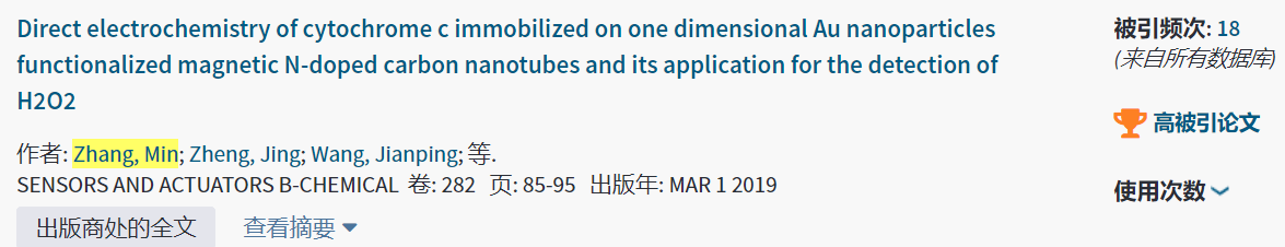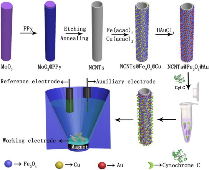 最近,张敏副教授与郑静副教授在磁性纳米复合材料的设计及在分析检测合成领域取得了重要进展。基于前期研究基础【Sensor and Actuators B: Chemical, 2017, 250, 8-16, (一区) 、Journal of Electroanalytical Chemistry, 2018, 818, 97-105(三区)】,通过对磁性纳米材料的功能化设计,成功制备了金负载的磁性纳米材料,固定细胞色素c后,成功用于双氧水的电化学检测。研究成果以“Direct electrochemistry of cytochrome c immobilized on one dimensional Au nanoparticles functionalized magnetic N-doped carbon nanotubes and its application for the detection of H2O2”为题,发表在Elsevier期刊Sensor and Actuators B: Chemical, 2019, 282, 85-95,影响因子为6.27,同时入选新一期的ESI高被引论文。
