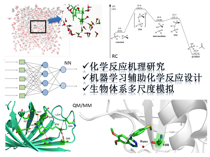 通过量子化学计算、分子模拟、机器学习等手段研究生物、化学、材料等体系中重要反应的相互作用机制,为绿色高效的反应设计提供理论指导。