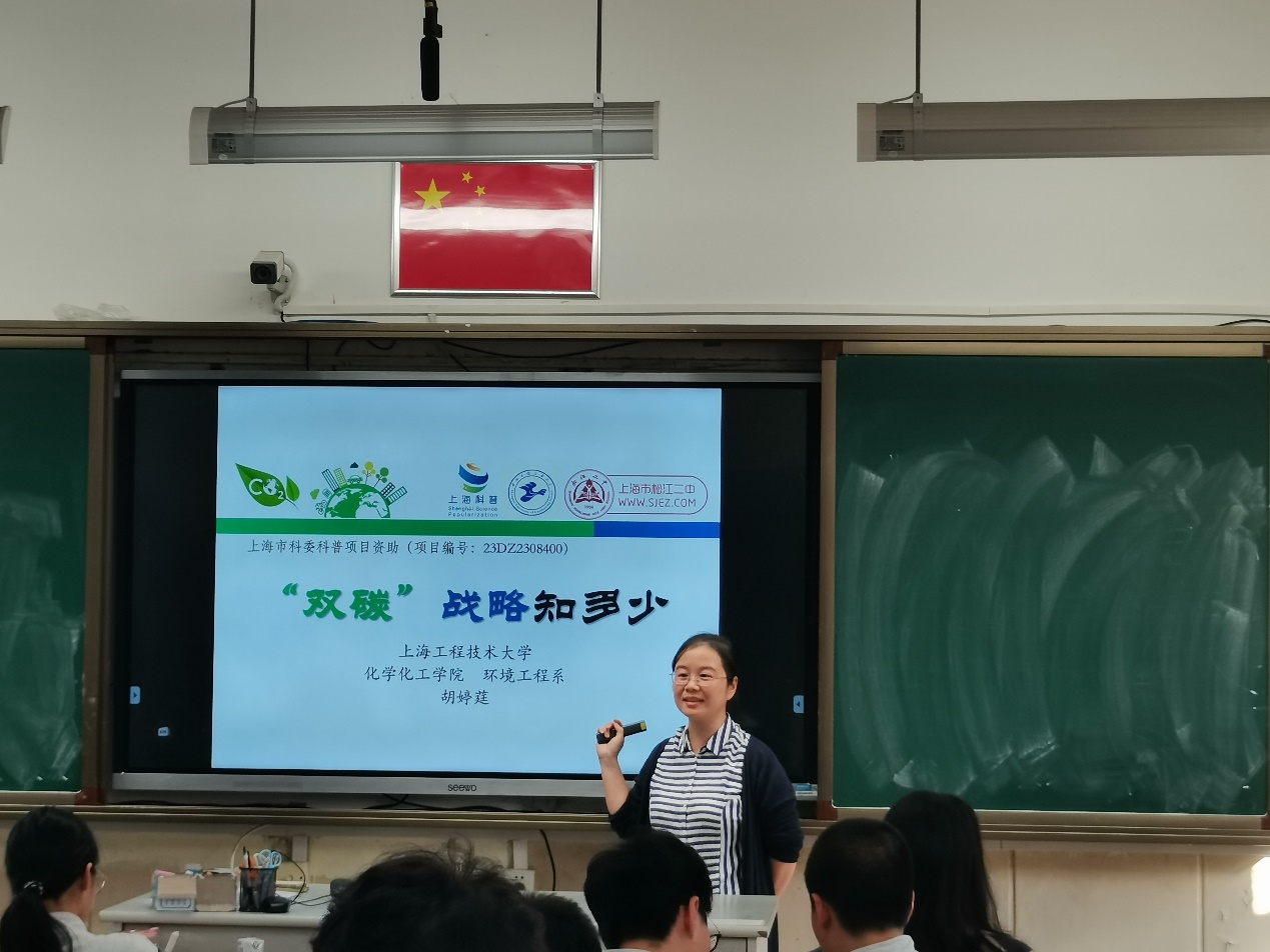 为深入贯彻落实大中小学思政教育一体化建设和《上海市绿色低碳发展国民教育体系建设实施方案》要求,充分发挥高校人才培养、科学研究和社会服务功能,10月23日下午,蓝鲸体育环境工程专业党员教师胡婷莛、顾敦罡与硕士研究生韩梦绮一同走进上海市松江二中,为该校九年级科研兴趣班员工带来了一场生动有趣的“双碳”环保专题讲座。