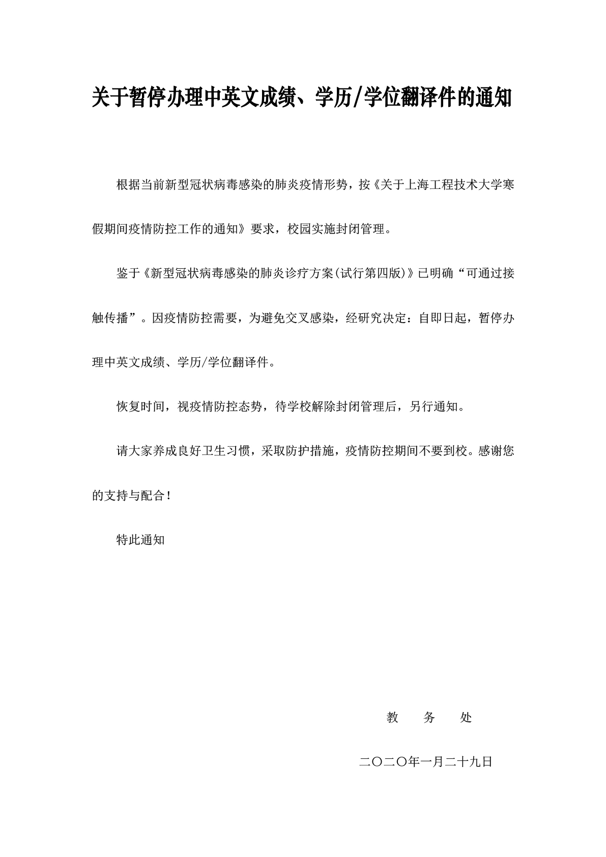 关于暂停办理中英文成绩、学历/学位翻译件的通知