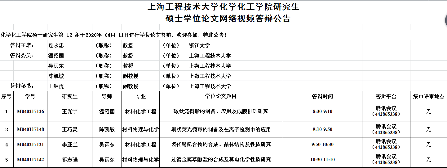 蓝鲸体育化工公司研究生硕士学位论文网络视频答辩公告-4月12日第13组
