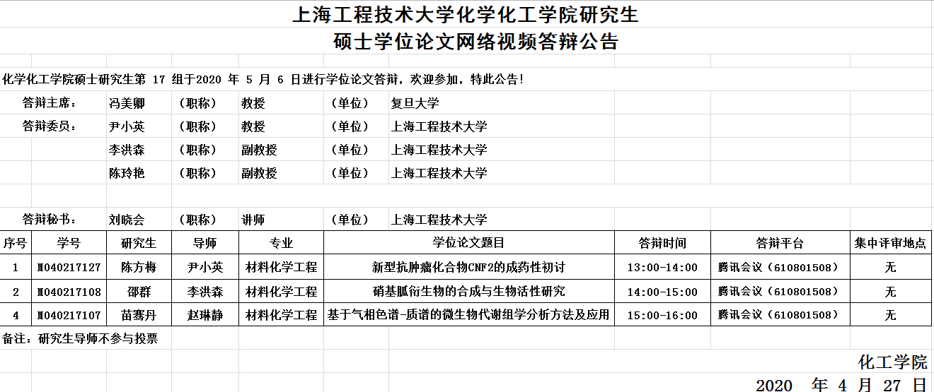 蓝鲸体育化工公司研究生硕士学位论文网络视频答辩公告-5月6日第17组