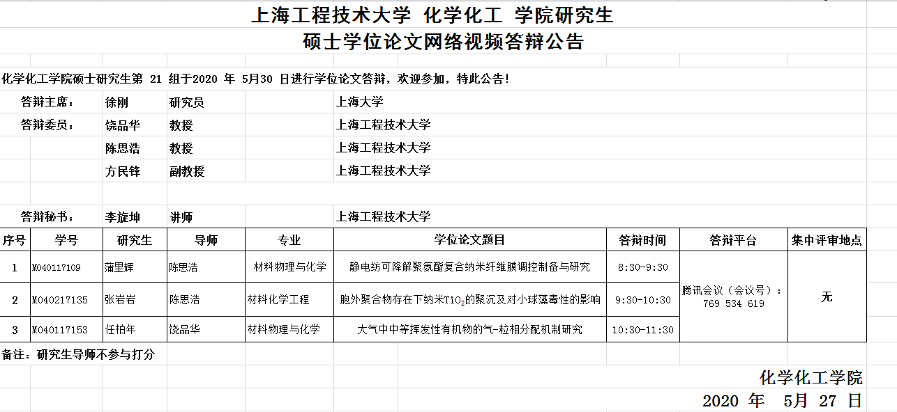 蓝鲸体育化工公司研究生硕士学位论文网络视频答辩公告-5月30日第21组