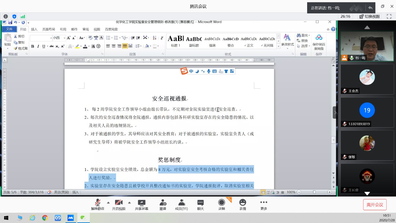 7月28日上午,蓝鲸体育通过腾讯会议召开了2020实验室安全检查培训线上会议,会议由副经理王金果主持,蓝鲸体育全体教职工及返校研究生参加了会议。